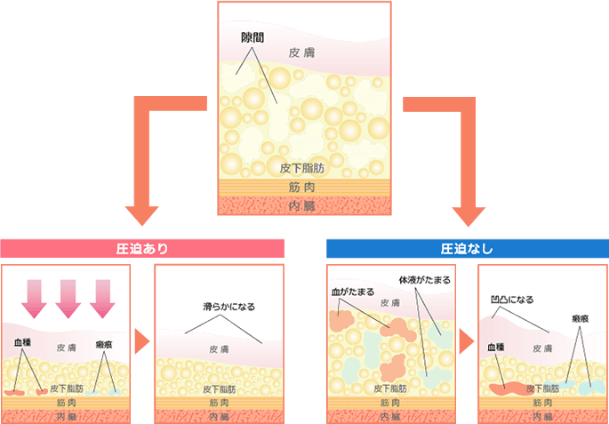 脂肪を吸引したところはハニカム(蜂の巣)状と言って隙間だらけになっています。これを放置すると腫れや血腫(血がたまってしまう)の原因となります。しっかりと圧迫することでこの腫れや血のたまりを防ぐことができます。また、圧迫を怠ると、長期的には凸凹の原因となりやすく、お肌に触れた時のスムースな感じになりません。
