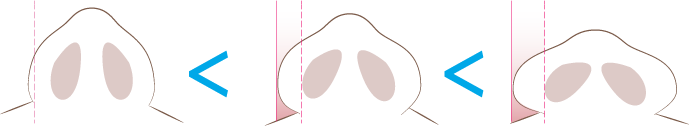 広がりが強いほど皮膚切除の必要性が高まりますが、そこをできるだけ外側の皮膚を切除しないように工夫して小さく自然な小鼻の形成を心掛けています。