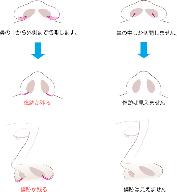 一般的な小鼻縮小術は小鼻の根元の皮膚を切ります。表面の皮膚をきると傷跡が残ります。